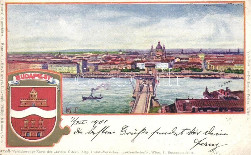 Leírás: Budapest, Lánchíd, gőzhajó, címer, művészlap. (EB)