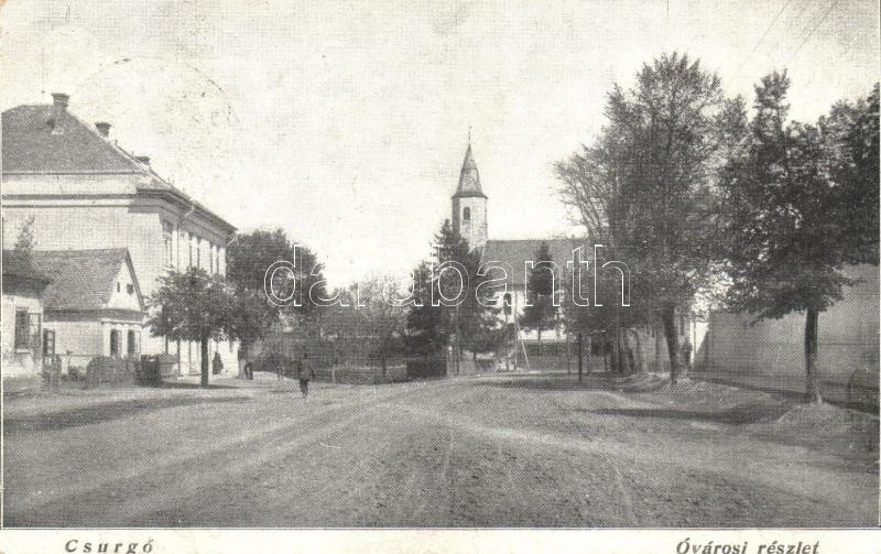 Leírás: Csurgó, Óvárosi részlet, utca és templom (EK)