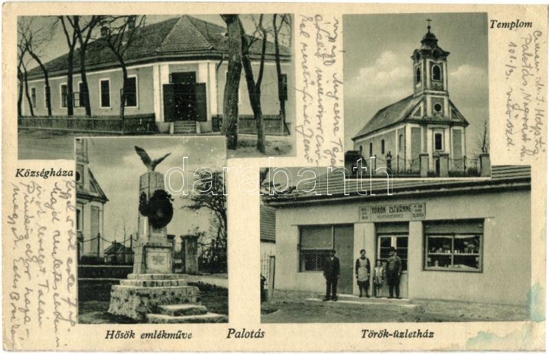 Leírás: Palotás, Községháza, Római katolikus templom, Hősök emlékműve, Török Istvánné üzlete és saját kiadása (EK)