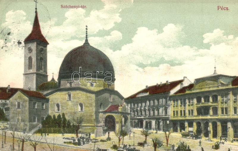Leírás: Pécs, Széchenyi tér, Nádor szálló, templom