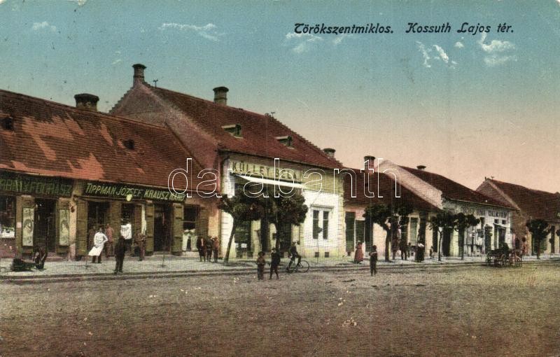 Törökszentmiklós, Kossuth Lajos tér, Külley Béla, Tippman József, Krausz Manó, Csillag Fülöp, Fischer Soma üzlete, kerékpár. Pannonia kiadás (apró szakadás / tiny tear)