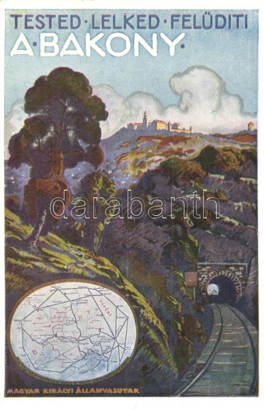 Bakony, A Magyar Királyi Államvasutak reklámlapja, hátoldalon a Bakony hegység turisztikai leírásával, kiadja Klösz György és Fia / Hungarian State Railways tourism campaign
