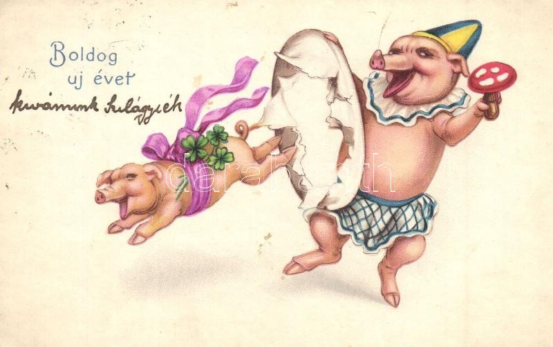 Boldog Újévet! / New Year greeting card, clown pigs. Amag 1897. litho ... https://www.darabanth.com/hu/318-Gyorsarveres/318.0/Kepeslapok/Udvozlolapok-Unnepek~2500084/Boldog-Ujevet-New-Year-greeting-card-clown-pigs-Amag-1897-litho-EK~II1753810