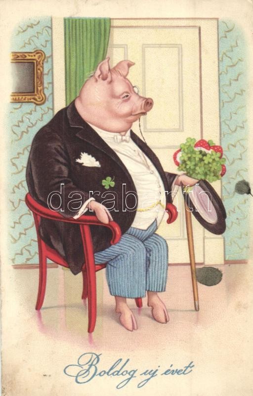 Boldog Újévet! / New Year greeting card, pig gentleman sitting in a ch... https://www.darabanth.com/hu/318-Gyorsarveres/318.0/Kepeslapok/Udvozlolapok-Unnepek~2500084/Boldog-Ujevet-New-Year-greeting-card-pig-gentleman-sitting-in-a-chair-Amag-1879-litho-EK~II1753814