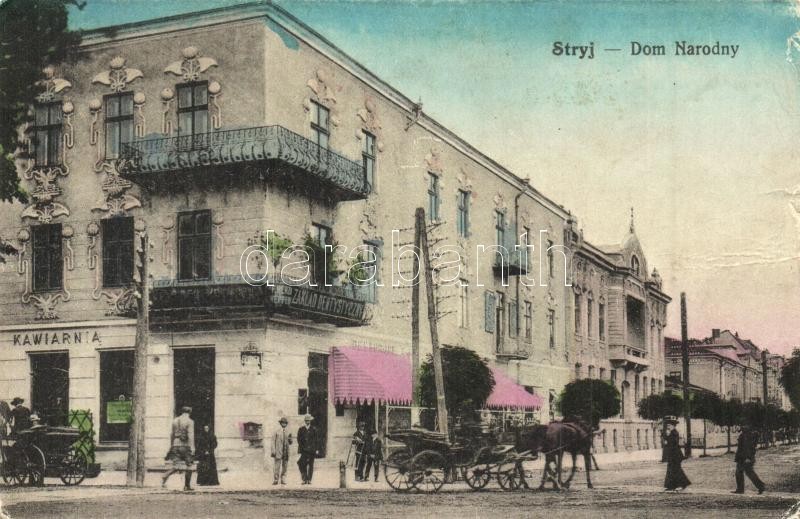 Leírás: Stryi, Stryj; Dom Narodny, Kawiarnia / street view, café, shops (kopott sarkak / worn corners)