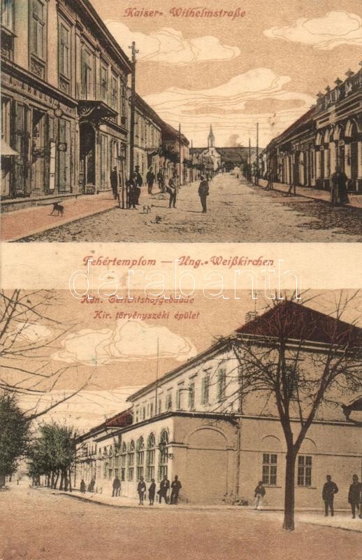 Fehértemplom, Ung. Weisskirchen, Bela Crkva; Kaiser Wilhelm-Straße, Kön. Gerichtshofgebäude / Vilmos császár út, A. Arnold üzlete, Kir. Törvényszéki épület. Gustav Wunder kiadása / street view, shops, court