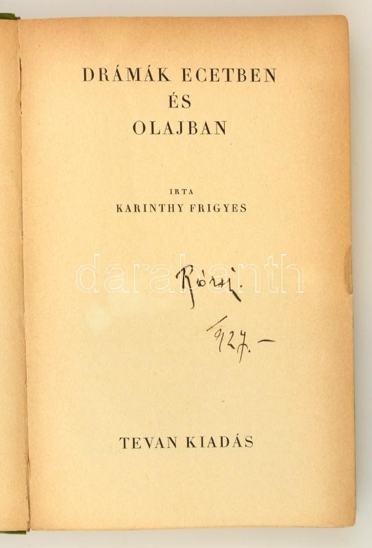 Karinthy Frigyes: Drámák ecetben és olaj. Békéscsaba,[1926], Tevan. Át... https://www.darabanth.com/hu/318-Gyorsarveres/318.0/Konyvek/Konyvek-Egyeb-ritkasagok~1500016/Karinthy-Frigyes-Dramak-ecetben-es-olaj-Bekescsaba-1926-Tevan-Atkotott-egeszvaszon-k~II1532875
