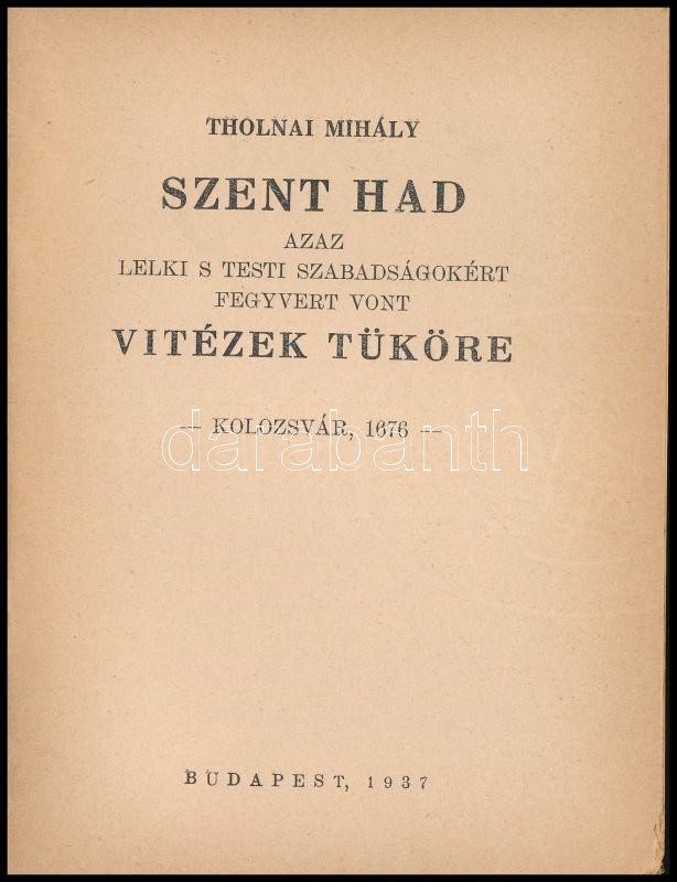 Tolnai Mihály: Szent had azaz a lelki s testi szabadságokért fegyvert vont vitézek tüköre - Kolozsvár 1676 - (A reformáció és ellenreformáció evangéliumi keresztyén (református és evangélikus) egyházi írói VI.) Bp.,1937, Bethlen-Nyomda Rt., 64 p. Kiadói papírkötés, az elülső borító kissé szakadt. Ritka.