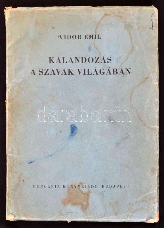 Leírás: Vidor Emil: Kalandozás a szavak világában. Bp.,(1942), Hungária. Kiadói papírkötés, foltos és kopott borítóval, sérült gerinccel, foltos, szakadt elülső szennylappal.