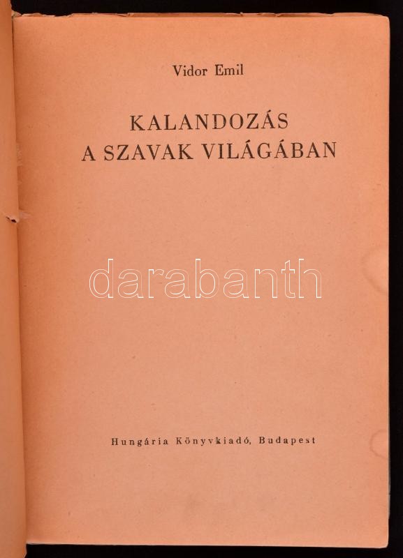 Vidor Emil: Kalandozás a szavak világában. Bp.,(1942), Hungária. Kiadó... https://www.darabanth.com/hu/318-Gyorsarveres/318.0/Konyvek/Konyvek-Egyeb-ritkasagok~1500016/Vidor-Emil-Kalandozas-a-szavak-vilagaban-Bp-1942-Hungaria-Kiadoi-papirkotes-foltos-C3~II1722463