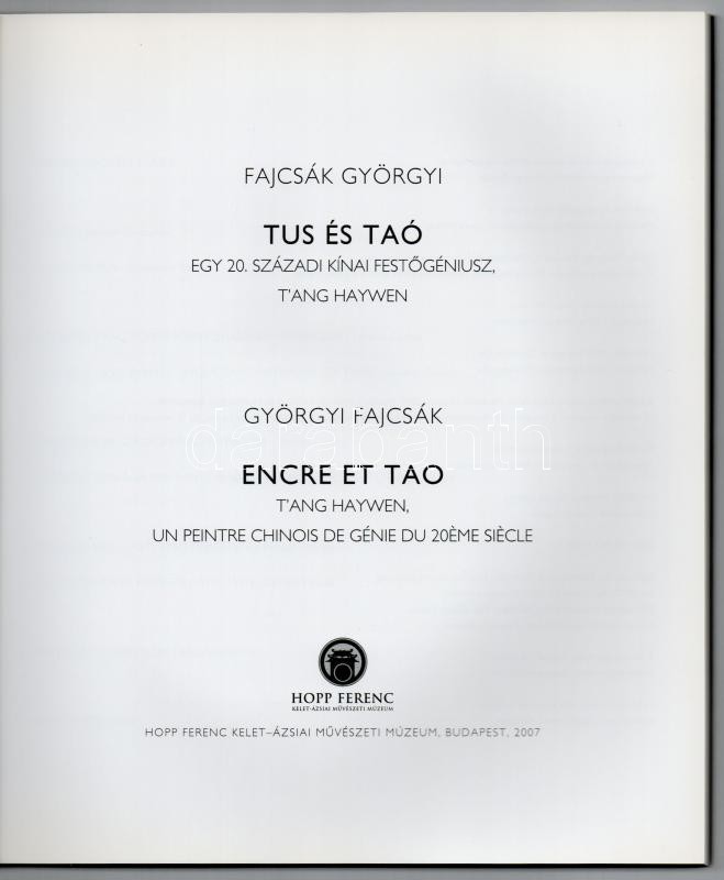 Fajcsák Györgyi: Tus és taó. Egy 20. századi kínai festőgéniusz, T'Ang Haywen. Bp., 2007, Hopp Ferenc Kelet-Ázsiai Művészeti Múzeum. Kiadói papírkötés, kissé karcos, egyébként jó állapotban.