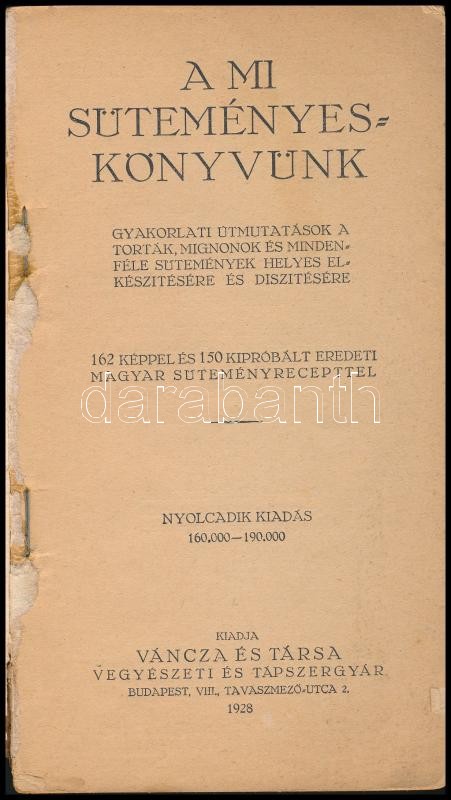A mi süteményes könyvünk. Gyakorlati útmutatások a torták, mignonok és mindenféle sütemények helyes elkészÃtésére és dÃszÃtésére. Bp., 1928, Váncza és Társa. Kiadói papÃrkötés, megviselt állapotban.