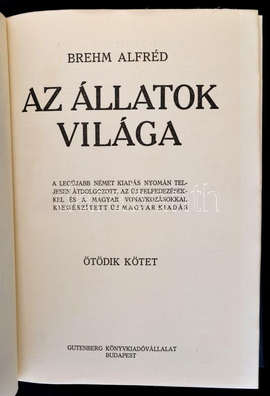 Brehm: Az állatok világa V. Emlősök. Ragadozó emlősök - Úszólábúak - Rágcsálók. Szerk. Dr. Éhik Gyula. Bp., Christensen és Társa, Gutenberg Könyvkiadóvállalat. Aranyozott félbőr kötés, kissé kopottas állapotban.