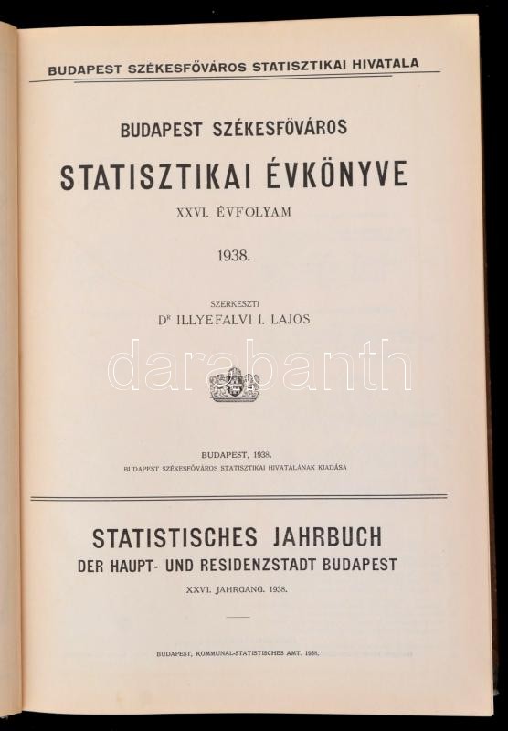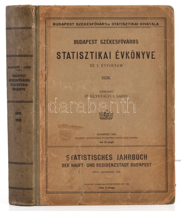 Budapest Székesfőváros Statisztikai Évkönyve XXVI. évfolyam. Szerk.: Dr. Illyésfalvi I. Lajos. Bp., 1938, Budapest Székesfőváros Statisztikai Hivatala. Kiadói félvászon-kötés, foltos, kopottas borítóval, kissé sérült gerinccel, magyar és német nyelven./
