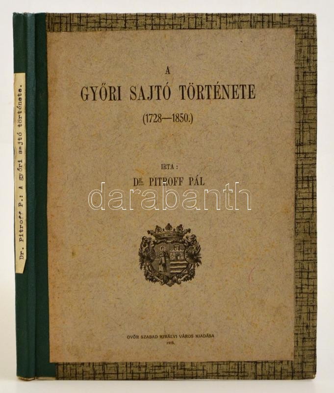 Dr. Pitroff Pál: A győri sajtó története (1728-1850). Győr, 1915, Győr Szabad Királyi Város. Félvászon kötés, ceruzás aláhúzásokkal, egyébként jó állapotban.