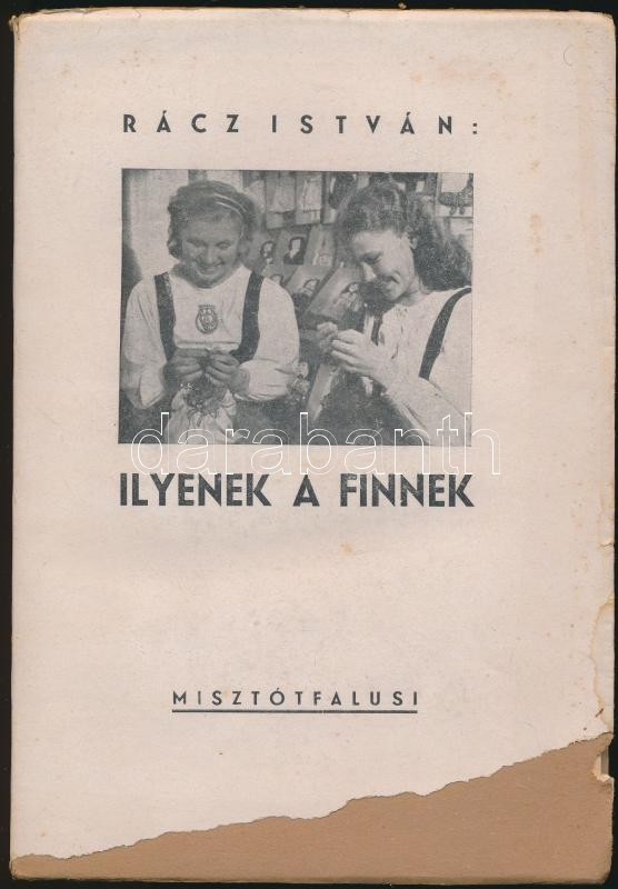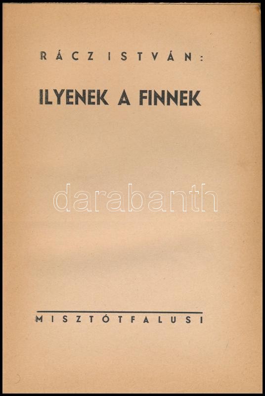 Rácz István: Ilyenek a finnek. (Bp.), 1944, Misztótfalusi, (Pápa, Főiskolai Nyomda-ny.), 105+8 p. Fekete-fehér fotókkal illusztrálva. Kiadói papírkötés, kiadói papír védőborítóban, a fotók felvágatlanok, a papír védőborító részben hiányos, egyébként jó állapotban.