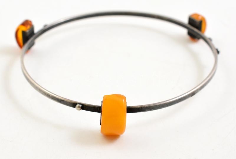 Leírás: Ezüst(Ag) karperec, borostyán díszítéssel, jelzett, d: 6,5 cm, bruttó: 8,5 g