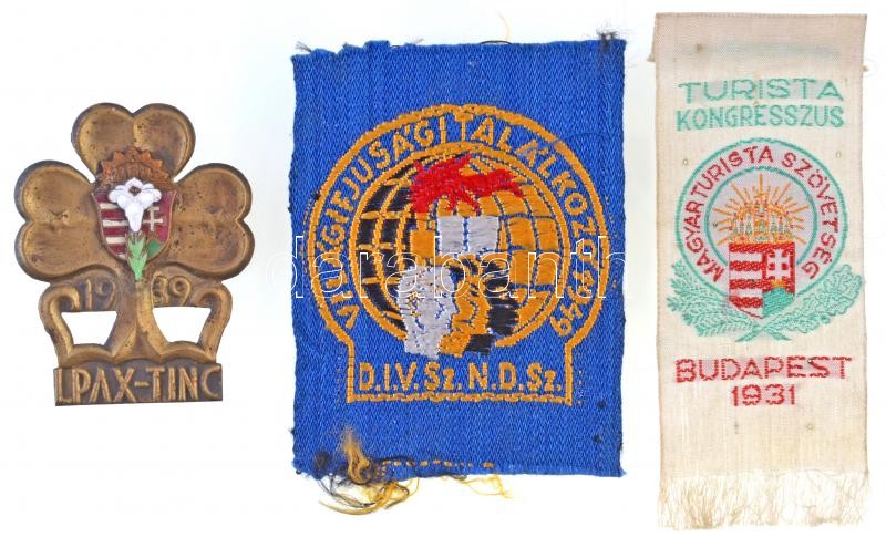 Leírás: 1939. "I. PAX-TING" Magyar Cserkészlány Szövetség zománcozott jelvénye a magyarországi világtalálkozó alkalmára (47x37mm) + 2db klf felvarró, "Turista Kongresszus - Budapest 1931"; "Világifjúsági Találkozó 1949" T:2