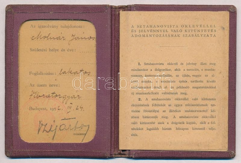 1951. "Sztahanovista" kitüntetéshez tartozó igazolvány. https://www.darabanth.com/hu/318-Gyorsarveres/318.0/Numizmatika/Falerisztika-Kituntetesek-jelvenyek~1000016/1951-Sztahanovista-kitunteteshez-tartozo-igazolvany~II1755391