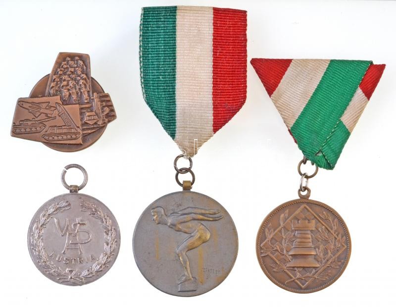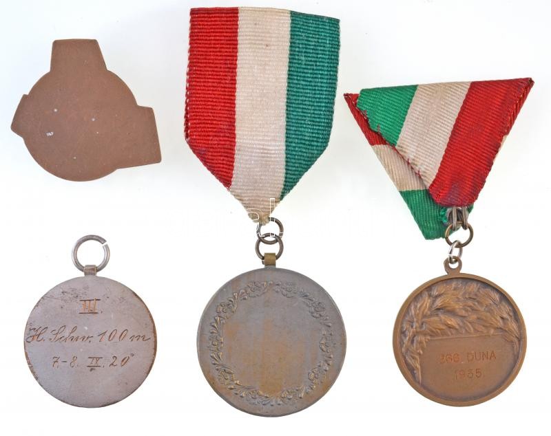 Leírás: Vegyes: 4db-os tétel, egy kivételével sport díjérmek, közte Ausztria 1920. "WSA" ezüstözött fém díjérem, hátoldalán gravírozva, szalag nélkül; 1935. sakk tematikájú díjérem, "266 DUNA" gravírozással, szalaggal T:vegyes