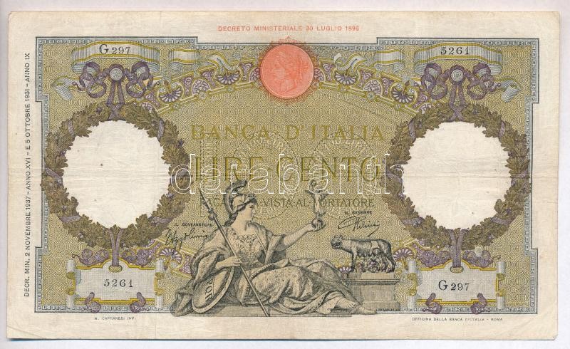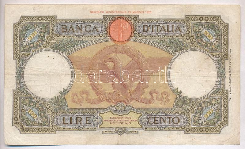 Italy 1937-1942. 100 ... https://www.darabanth.com/hu/318-Gyorsarveres/318.0/Numizmatika/Kulfoldi-bankjegyek~1000011/Olaszorszag-1937-1942-100L-TIII-III-tulyukak--Italy-1937-1942-100-Lire-CF-VG-needle-holes~II1756778