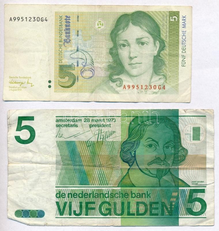 Mixed: N... https://www.darabanth.com/hu/318-Gyorsarveres/318.0/Numizmatika/Kulfoldi-bankjegyek~1000011/Vegyes-Hollandia-1973-5G-plus-Nemetorszag-1991-5M-TIII-III---Mixed-Netherlands-1973-5-Gulden-plus-~II1752963