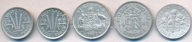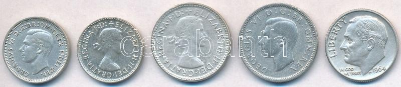 5db-os kis ezüst tétel; Ausztrália 1951. 3p Ag "VI. György" + 1960. 3p Ag "II. Erzsébet" + 1963. 6p Ag "II. Erzsébet" + Nagy-Britannia 1942. 6p Ag "VI. György" + Amerikai Egyesült Államok 1964. 1d Ag "Roosevelt" T:2,2-