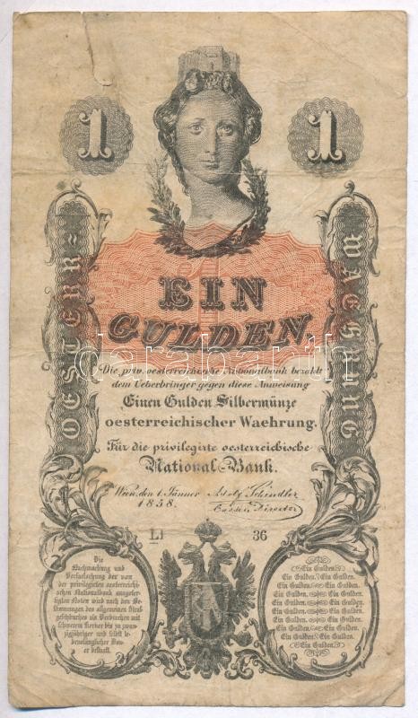 Austrian Empire 1858. 1 Gul... https://www.darabanth.com/hu/318-Gyorsarveres/318.0/Numizmatika/Magyar-bankjegyek~1000006/1858-1G-vizjeles-papiron-TIII-szakadas--Austrian-Empire-1858-1-Gulden-on-watermarked-paper-C~II1749946