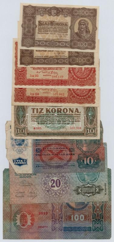 Leírás: 1912-1923 8db-os vegyes magyar korona bankjegy tétel, közte felülbélyegzettek is T:III,III-,IV