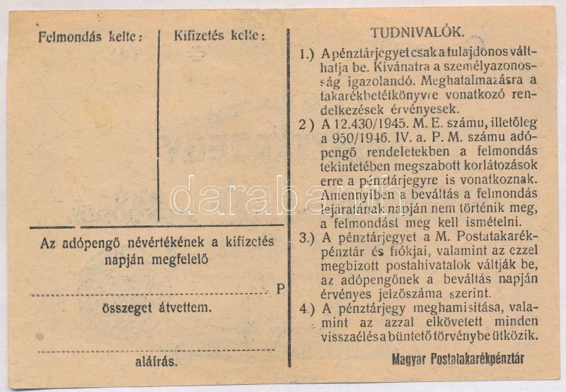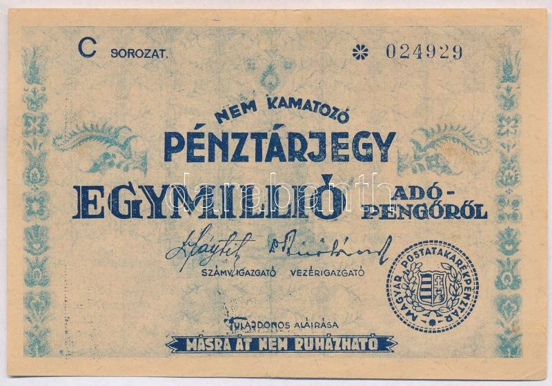 Leírás: 1946. 1.000.000AP nem kamatozó Pénztárjegy "Másra Át Nem Ruházható" bélyegzés nélkül T:II-,III