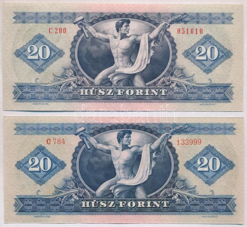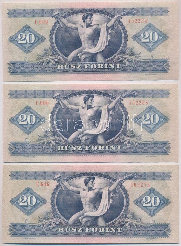 1969-1975. 20Ft (5x) közte 2db közeli sorszám T:I- https://www.darabanth.com/hu/318-Gyorsarveres/318.0/Numizmatika/Magyar-bankjegyek~1000006/1969-1975-20Ft-5x-kozte-2db-kozeli-sorszam-TI-~II1755187
