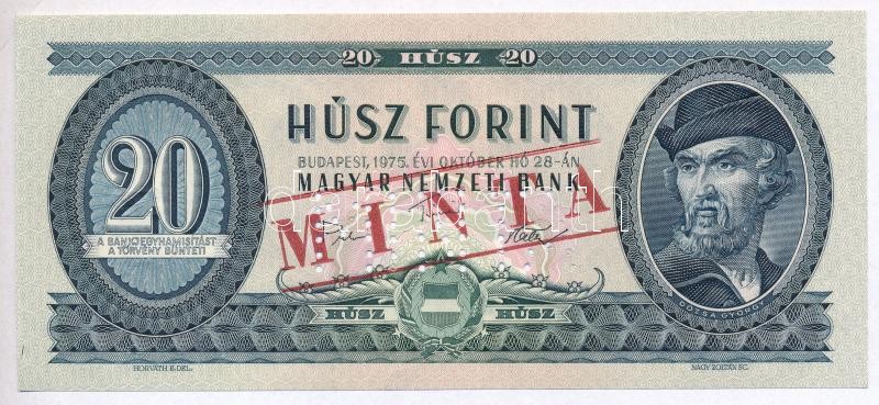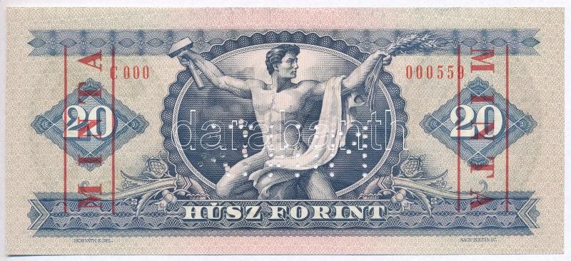 Leírás: 1975. 20Ft "C000 000559" sorozat és sorszámmal illetve piros "MINTA" felülnyomással és perforációval T:I