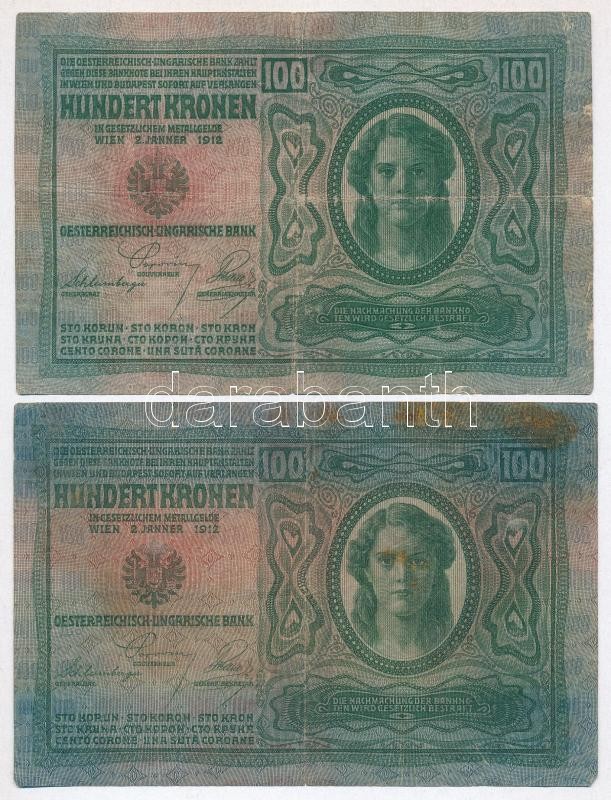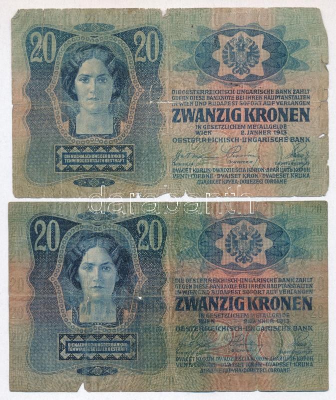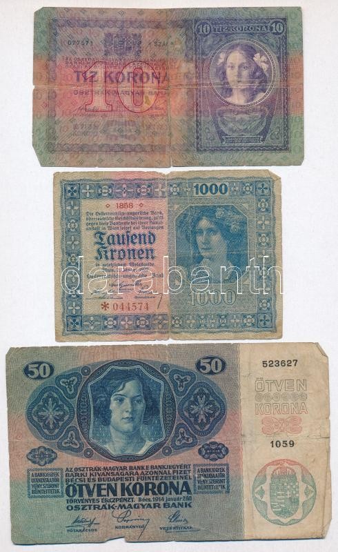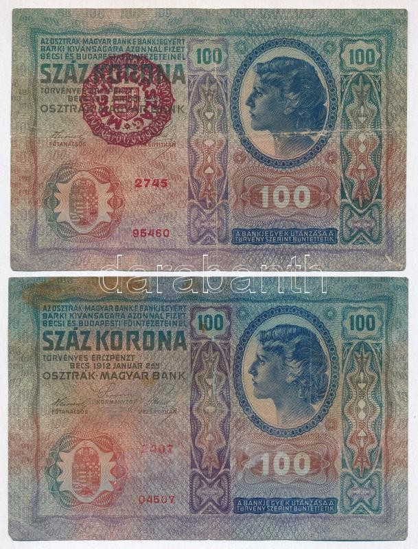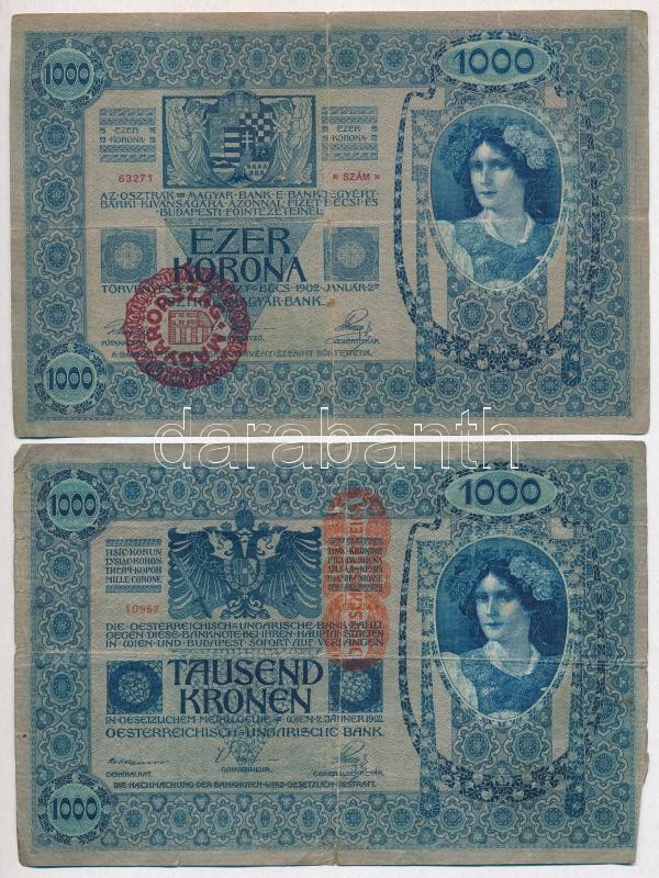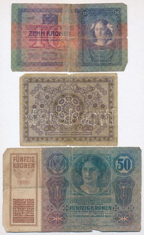 Vegyes: 9db-os korona bankjegy tétel, több darabon piros "MAGYARORSZÁG" felülbélyegzés, 10-20-50-100-1000K-ás címletek, közte egy osztrák kiadás T:III-IV egyik ragasztva