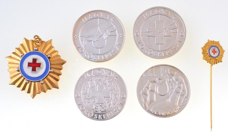 Leírás: DN 25 "Véradásért / Magyar Vöröskereszt" + "50 Véradásért" + "75 Véradásért" + "100 Véradásért" fém emlékérmek, zománcozás/festés nélkül + "Véradó" kitüntetés szalag nélkül, miniatűr kitűzővel T:1-,2