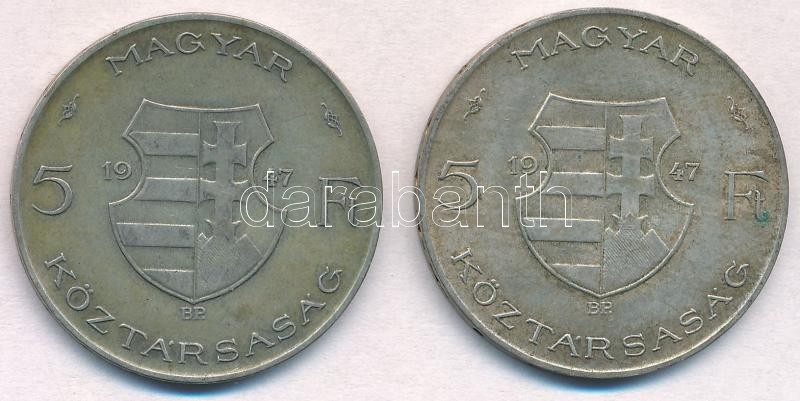 1947. 5Ft Ag "Kossuth" (2x) T:2,2- patina, ph. https://www.darabanth.com/hu/318-Gyorsarveres/318.0/Numizmatika/Magyar-es-magyar-verdejelu-fem-es-ezustpenzek~1000007/1947-5Ft-Ag-Kossuth-2x-T2-2-patina-ph~II1751167