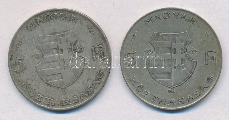 1947. 5Ft Ag "Kossuth" (2x) T:2-,3 https://www.darabanth.com/hu/318-Gyorsarveres/318.0/Numizmatika/Magyar-es-magyar-verdejelu-fem-es-ezustpenzek~1000007/1947-5Ft-Ag-Kossuth-2x-T2-3~II1748761