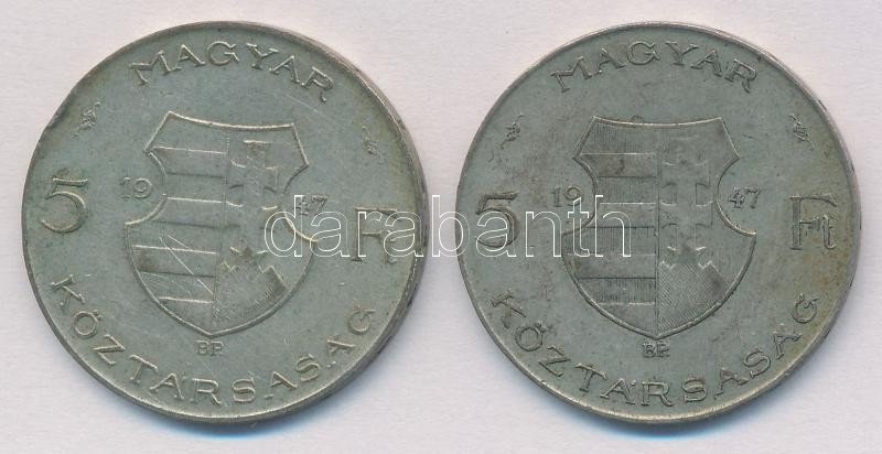 1947. 5Ft Ag "Kossuth" (2x) T:2-,3 https://www.darabanth.com/hu/318-Gyorsarveres/318.0/Numizmatika/Magyar-es-magyar-verdejelu-fem-es-ezustpenzek~1000007/1947-5Ft-Ag-Kossuth-2x-T2-3~II1753833