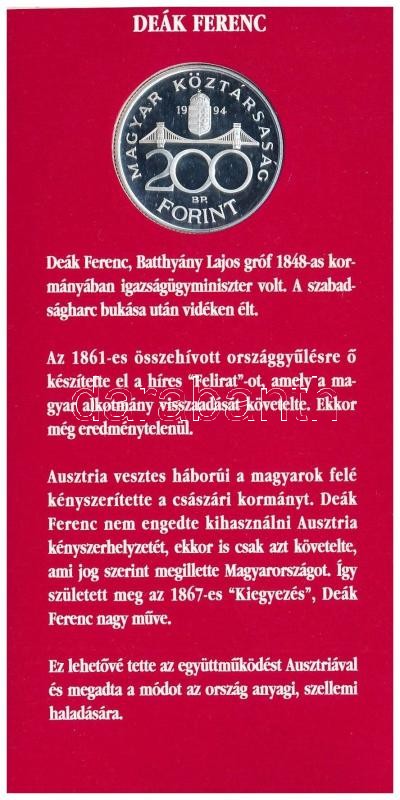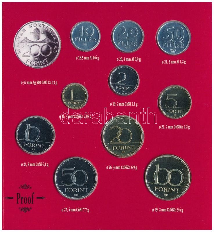 Leírás: 1994. 10f-200Ft (11xklf) forgalmi sor dísztokban, közte 1994. 200Ft Ag "Deák" T:PP Adamo FO27.3