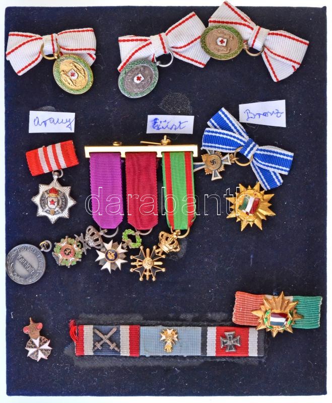 15db klf kitüntetéshez tartozó miniatűr, ebből 12db szalagsávon (néhány modern), közte "A Magyar Népköztársaság Zászlórendjének miniatűrje", "Magyar Háborús Emlékérem miniatűr", "Vörös Kereszt Díszérme miniatűr" T:1-,2 15pcs of diff decoration miniatures with 12pcs of thin ribbons (some modern pieces), including "Flag Order of the Hungarian People's Republic", "Hungarian Commemorative War Medal", "Red Cross, Medal of Honour" C:AU,XF