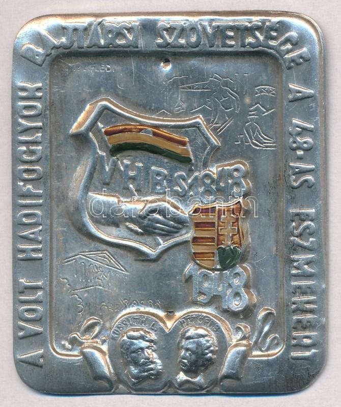 Leírás: 1948. "VHBS 1848-1948 - A volt hadifoglyok bajtársi szövetsége a 48-as eszmékért" festett Al jelvény (52x61mm) T:2 tűhiány
