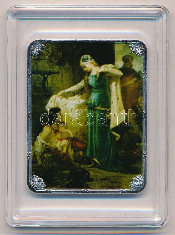 Leírás: DN "Magyar Festészet Remekei - Liezen-Mayer Sándor: Magyarországi Szent Erzsébet, 1882" ezüstözött Cu emlékérem multicolor festéssel, tanúsítvánnyal (46x36mm) T:PP