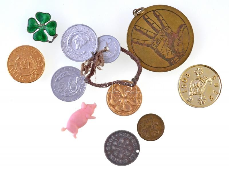 Leírás: 10db-os vegyes szerencsepénz tétel, mellette még egy szerencsemalac T:vegyes
