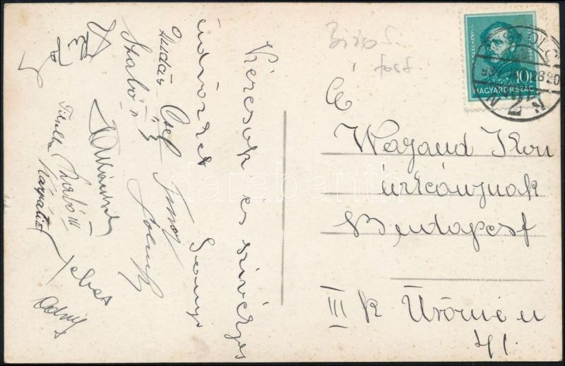 1934 A magyar foci válogatott tagjai és Bíró Sándor (1911-1988) által aláírt képeslap Tischka, Turai, Szabó Antal, Sebes Gusztáv, Dudás, Kárpáti és mások / Hungarian national football team autograph signed postcard