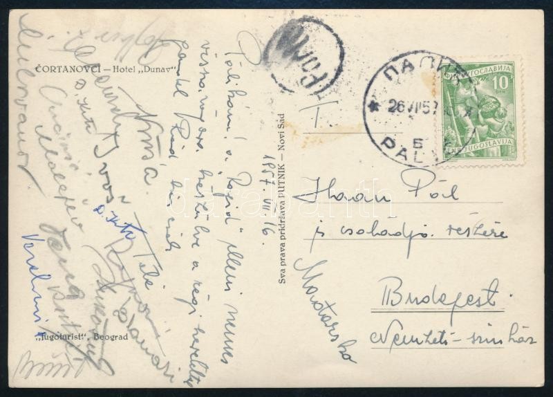 1957 Újvidék, Sportolók aláírása hazaküldött képeslapon https://www.darabanth.com/hu/319-Gyorsarveres/319.0/Festmeny-mutargy-papirregiseg-egyeb/Alairas~19/1957-Ujvidek-Sportolok-alairasa-hazakuldott-kepeslapon~II1761203
