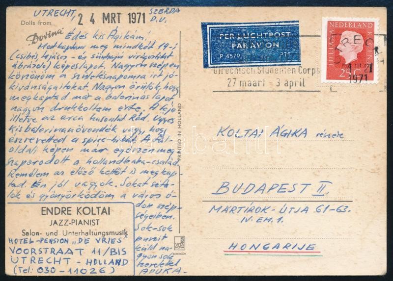 Leírás: 1971 Koltai Endre jazz zongorista saját kézzel írt képeslapja lányának