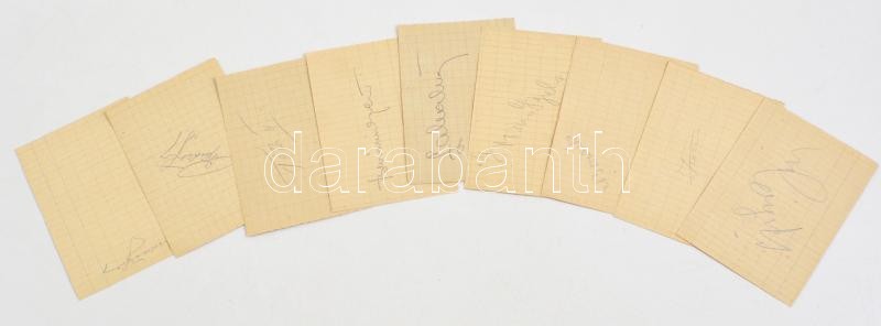 Leírás: Az Aranycsapat 8 tagjának aláírásai noteszlapokon. Puskás (2x), Buzánszky, Grosics, Tóth II. Czibor, Bozsik, Zakariás,