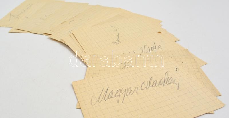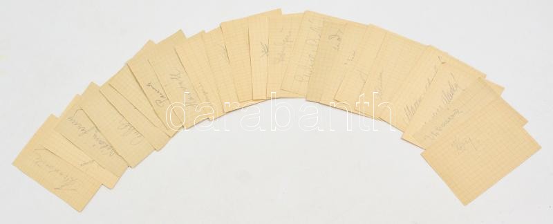 Az FTC, Kinizsi, Édosz labdarúgócsapatok tagjainak és edzők aláírásai noteszlapokon.Anda, Kispéter, Lakat Károly, Guba, Ombodi, Rudas, Csoknyai és mások, összesen 24 db