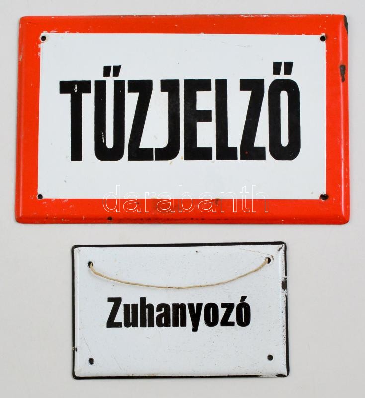 2 db zománctábla, "Zuhanyozó" ill. "Tűzjelző"