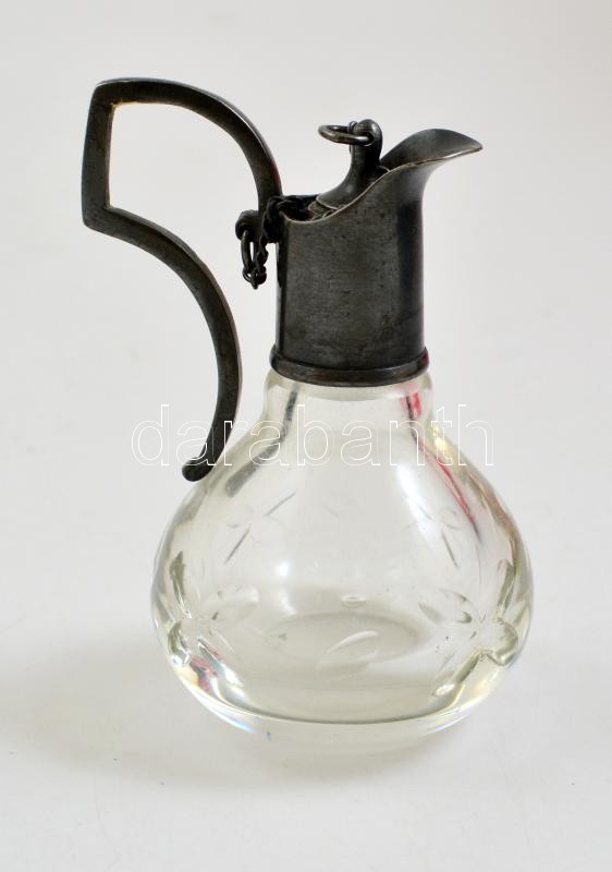 Leírás: Mini üveg karafa, fém füllel és kiöntővel, m: 8 cm