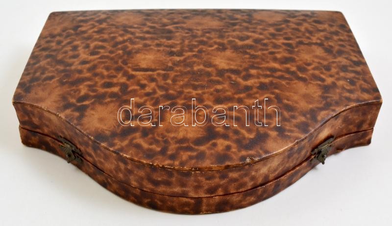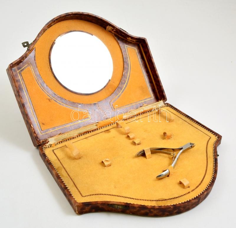Leírás: Pipere fa doboz, belsejében tükörrel, egy körömvágóval, kopásnyomokkal, 26x21x4 cm